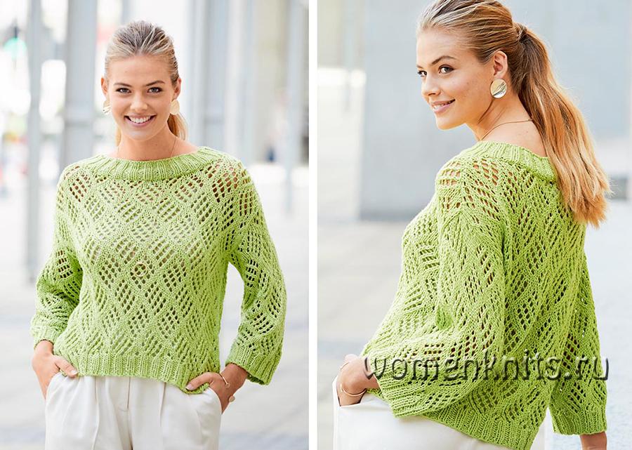Джемпер в ажурные ромбы, с закругленной линией низа, широкими рукавами и вырезом 'лодочка'. Спицами. / womanknits.ru