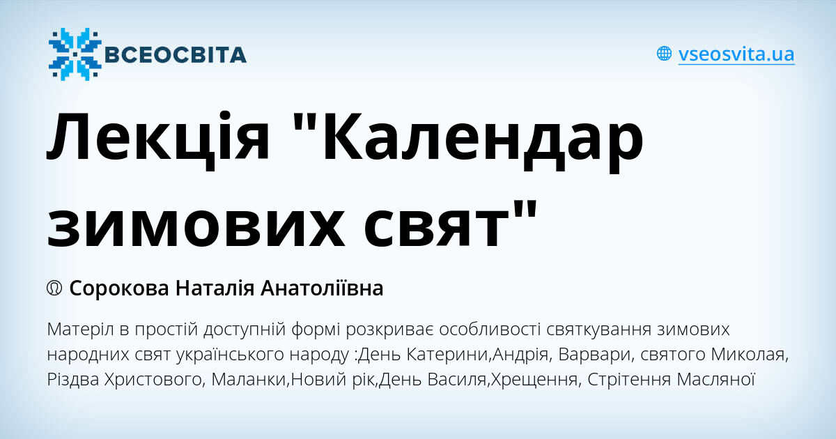 Лекція "Календар зимових свят" Матеріл в простій доступній формі розкриває особливості святкування зимових народних свят українського народу :День Катерини,Андрія, Варвари, святого Миколая, Різдва Христового, Маланки,Новий рік,День Василя,Хрещення, Стрітення Масляної