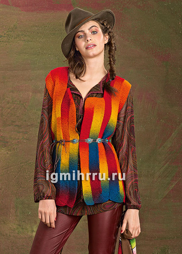 Разноцветный жилет с длинными полосами. Вязание спицами со схемами и описанием