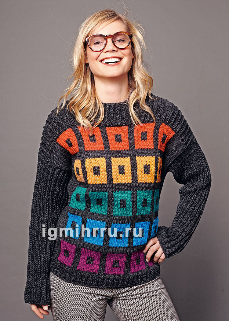 Теплый пуловер с жаккардовым клетчатым узором. Вязание спицами со схемами и описанием