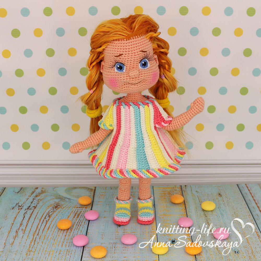 Карамелька. Амигуруми куколка Карамелька связана из гладкой ниточки на проволочной основе. Кукла подойдет для вязания начинающим мастерицам. Бесплатное описание по вязанию крючком куколки Карамельки представлено на сайте