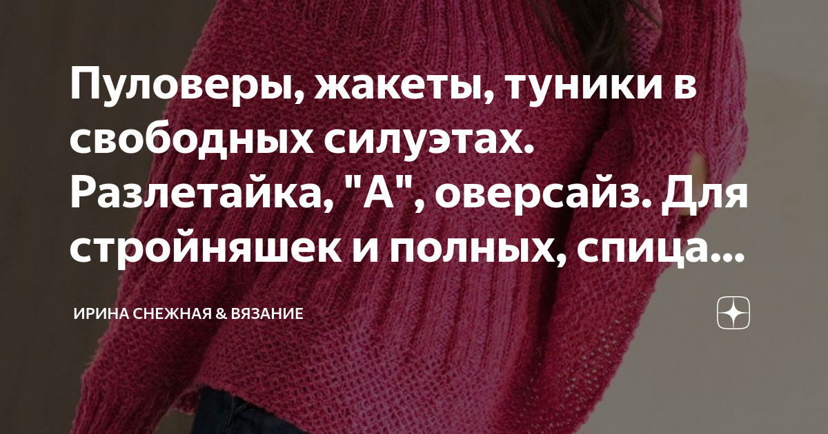 Пуловеры, жакеты, туники в свободных силуэтах. Разлетайка, "А", оверсайз. Для стройняшек и полных, спицами и крючком. Вот и настал у многих из нас период уютных вечеров для творчества. Практически закончились дачные хлопоты, отпуска и теперь можно уделить время себе любимой. Кто то достал свой недовяз, кто то занялся утепление ножек и ручек, кому то срочно нужна шапочка или снуд. Кому то просто новая и красивая моделька.