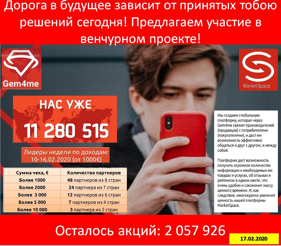 Друзья, это не просто шанс, ЭТО ШАНС! Сейчас мы стоим 263 МИЛЛИОНА ДОЛЛАРОВ! Нас уже более 11 млд пользователей!!! Доходы партнеров зашкаливают!! Готовится новая оценка мессенджера GEM4ME. Будет МИЛЛИАРД!!! ВСЕ в ВАШИХ руках. Через два, три, шесть месяцев, Вы будете стоить в 4 раза дороже! Кому интересно получить очень большой доход, обращайтесь в личном сообщении. Вместе СДЕЛАЕМ 20 МЛРД. https://sirin.marketspace.team/ Вы также можете без оплаты открыть свой бизнес-центр: