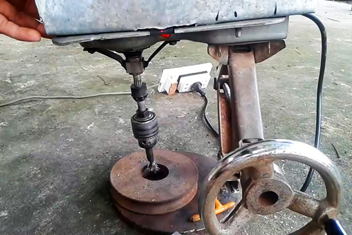 Как сделать сверлильный станок из домкрата и двигателя стиралки Двигатель и редуктор от старой стиральной машины с вертикальным барабаном можно использовать для изготовления сверлильного станка. Применение этих деталей делает процесс сборки очень простым и дешевым, поскольку они закреплены на монтажной пластине, которая может использоваться как часть рамы