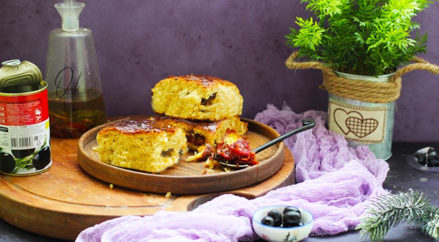 Ароматная бриошь холодной расстойки с добавлением оливок, вяленых томатов и моцареллой