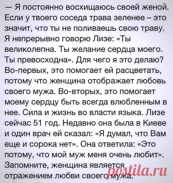 Я очень взаимный человек и поэтому согласна с тем, что женщина является отражением любви своего мужа, если я чувствую, что меня любят и ценят, я готова отдавать ещё больше, трудиться во благо этих отношений. ______________ А как считаете вы