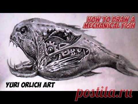 Как нарисовать механическую рыбу в стиле биомеханика карандашом.