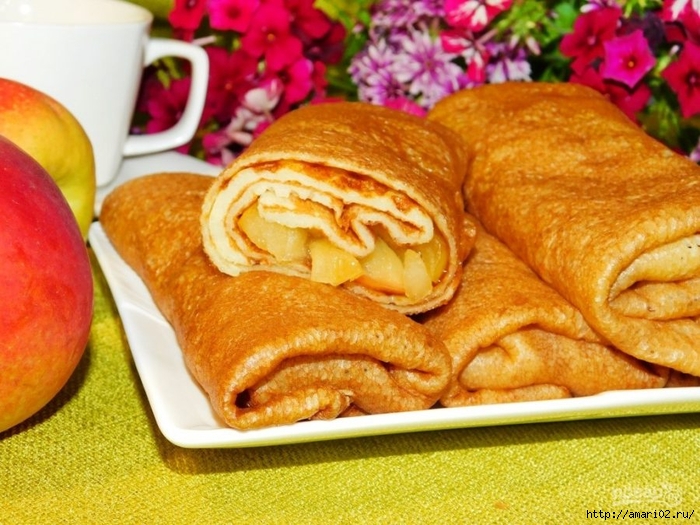 Рецепт творожных блинов с яблочной начинкой в карамели