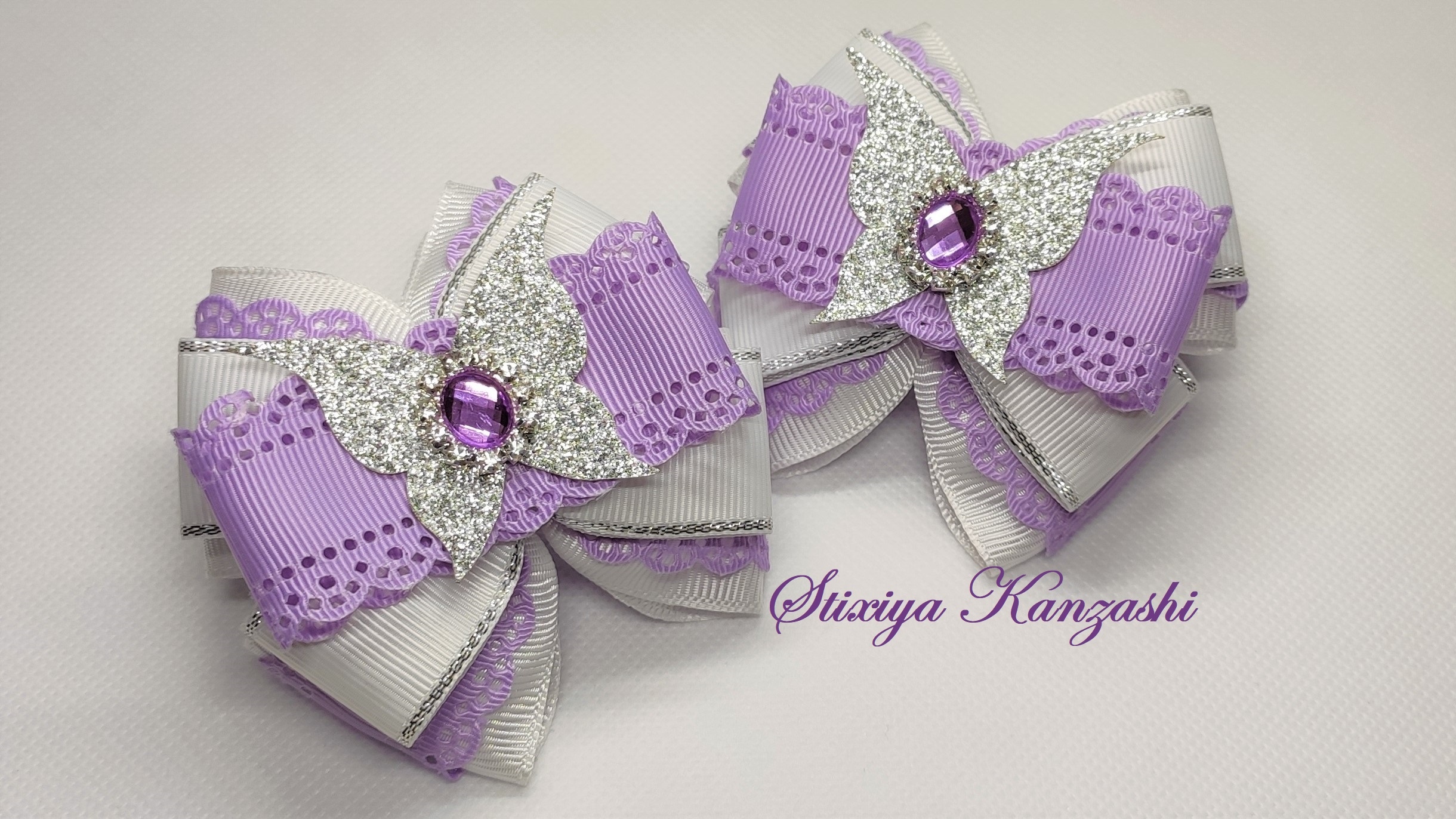 Украшение на заколку Канзаши / Нежные пышные бантики с бабочками