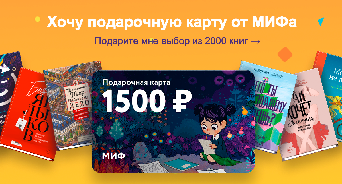 Полезный и удобный подарок: электронная карта МИФа. У нас есть карты номиналом 500, 1500, 2000, 3000, 5000 и 10 000 рублей. На каждую сумму можно купить отличные бумажные и электронные книги. Вы выбираете нужную, а мы доставляем красивое письмо с картой на любую электронную почту мира за пару секунд.