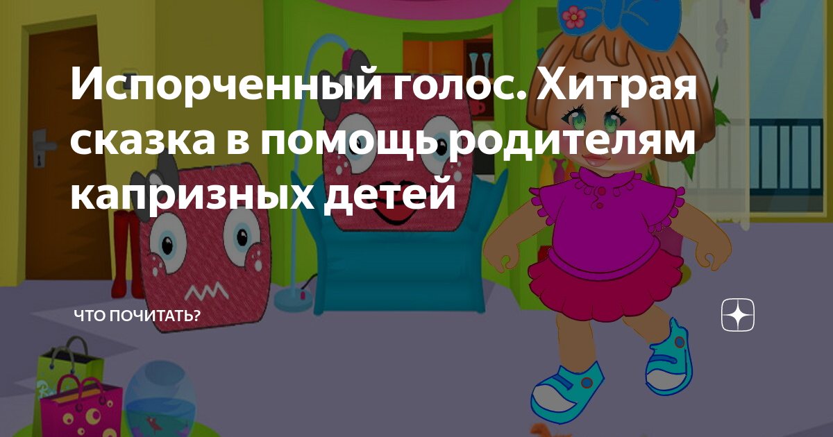 Испорченный голос. Хитрая сказка в помощь родителям капризных детей У девочки Сони испортился голос. Совсем перестал её слушаться. Начнет Соня говорить с мамой обычным своим, девочкиным голосом, и вдруг как запищит гнусаво: «Не хочу!», мама пугается до икоты. Или соберется в магазине папу попросить купить ей мороженое, а вместо детского голоска скрипучий бас: «Купи! Купи мороженое!». Тетенька продавец прямо со стула упадет, очередь вся попятится, а некоторые