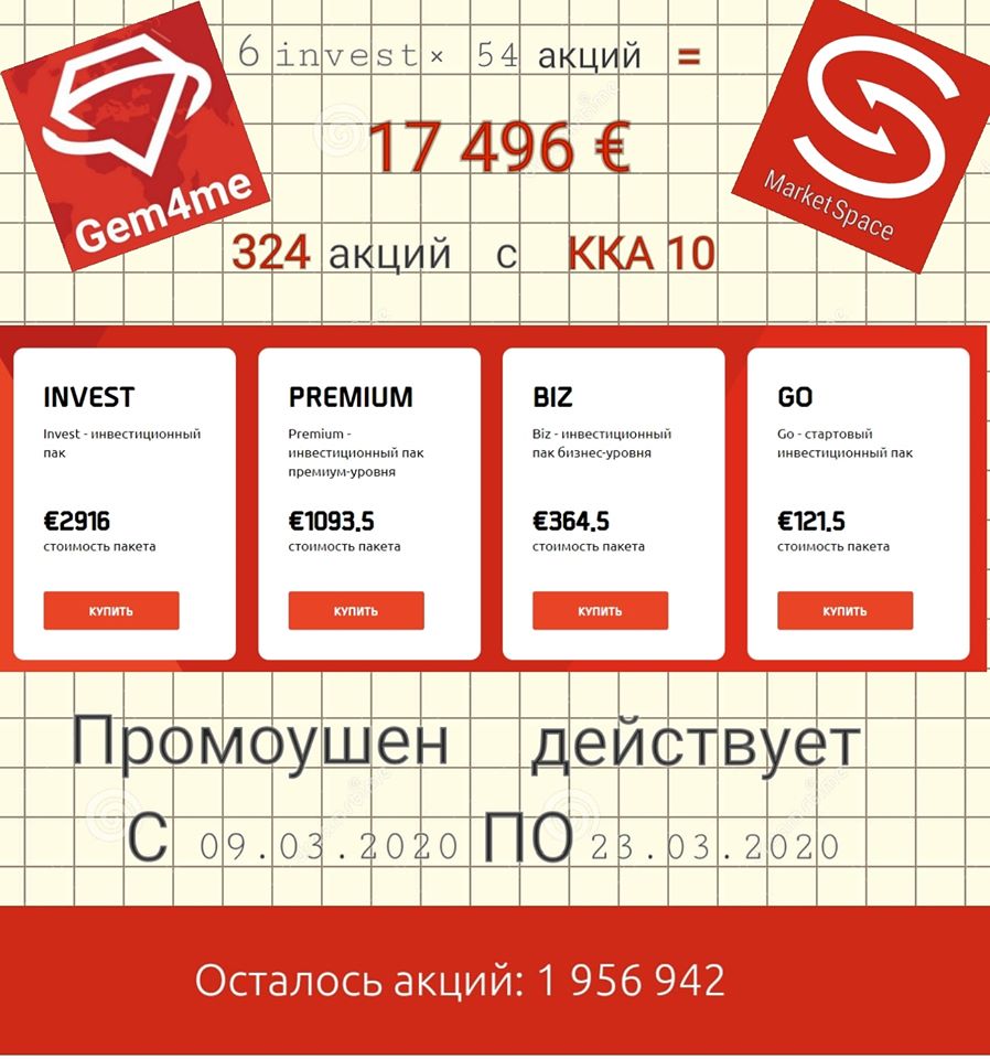 Дорогие друзья! Представляем вашему вниманию короткий, но очень выгодный промоушен, по условиям которого партнеры смогут приобрести все пакеты акций со скидкой. Условия промоушена: В период действия данного промоушена действует скидка 10% на все бизнес-пакеты: Go/Biz/Premium/Invest и суперпак. Период действия промоушена: 9 марта, 16.00 (мск) — 23 марта 2020 года. Более расширенно , по ссылке 👉 : https://sirin.marketspace.team/