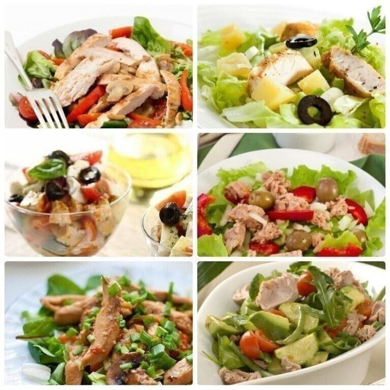 Подборка фитнес салатов 1. Вареное куриное филе + огурец + пекинская капуста + сыр + оливковое масло 2. Пекинская капуста + огурец + помидор + консервированная кукуруза + оливковое масло + яблочный уксус 3. Вареная фасоль + помидор + вареное яйцо + укроп + зеленый лук + оливковое масло 4. Вареное куриное филе + пекинская капуста + болгарский перец + огурец + авокадо + оливковое масло 5. Вареное куриное филе + руккола + листья салата + редис + оливковое масло 6. Туне...