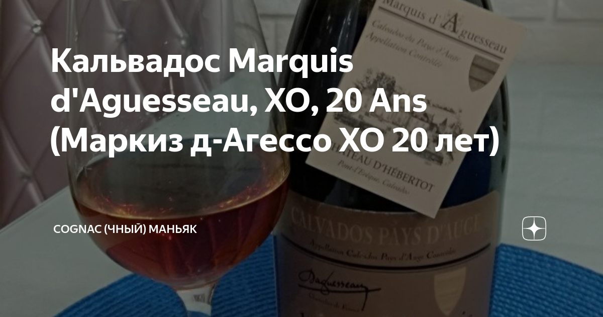 Кальвадос Marquis d'Aguesseau, XO, 20 Ans (Маркиз д-Агессо ХО 20 лет) Данная статья содержит сведения об алкоголе. Предупреждаю, чрезмерное употребление алкоголя вредит вашему здоровью Мои читатели, всем привет! Давно я сам не писал обзоры (как многие знаю на это есть причины). И первый после новогодний обзор будет не обычным. Немного разбавим темы про коньяк и вспомним о его брате, нет не о арманьяке, а кальвадосе. Это первый обзор кальвадоса на моем канале.