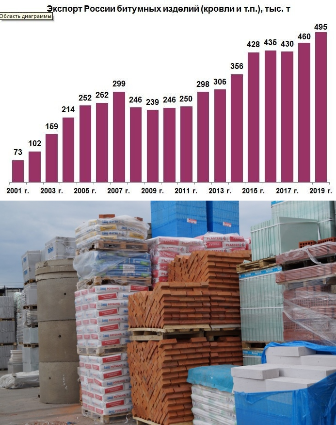 Российский экспорт строительных материалов и изделий в 2019 году достиг рекордного уровня в стоимостном выражении - около 2...2,5 млрд долл. При этом Россия с 1997 года является мировым лидером по экспорту асбеста, а последние несколько лет занимает второе место в мире по экспорту строительных изделий из битума, уступая только США.