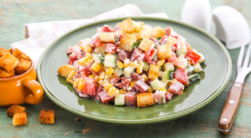 Салат с сухариками, колбасой и кукурузой - ПУТЕШЕСТВУЙ ПО САЙТУ. Салат с сухариками, колбасой и кукурузой не претендует на принадлежность к высокой кухне. Не стоит искать в нем также запредельных полезных свойств: он, скорее, просто по-домашнему вкусный. А еще такой салат имеет приятную хрустящую текстуру — благодаря сухарикам, консервированной кукурузе и свежим огурцам. Очень аппетитно! Только непременно учтите, что это …