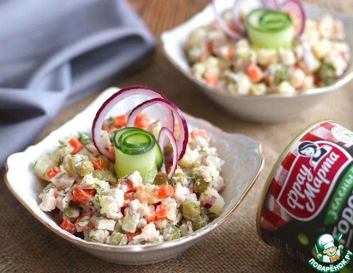 - Соединить в миске все составляющие салата, добавить консервированный горошек ТМ "Фрау Марта" (3 ст. ложки), добавить свежую зелень укропа (1 пуч.). Заправить салат майонезом.