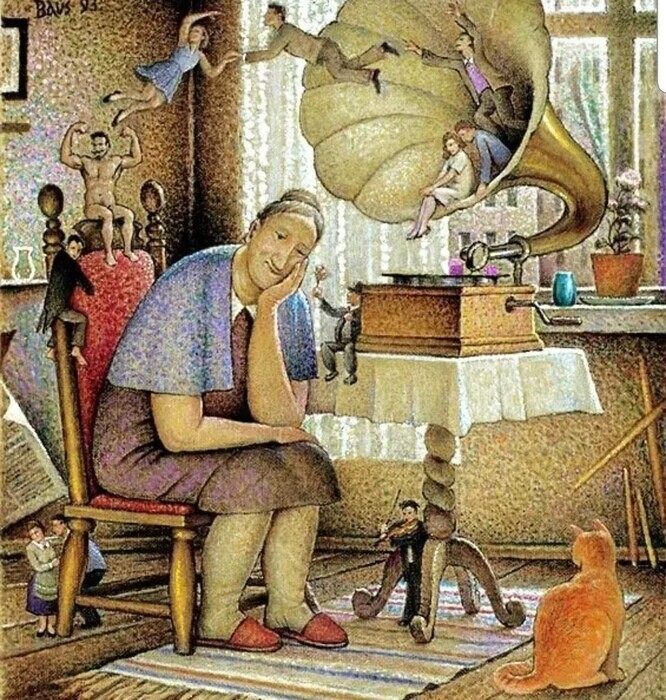 Ах, как порою хочется На глупость заморочиться. Забыть, что уж по отчеству Зовут меня давно. Стереть следы усталости. Гнать мысль, что дело к старости. Творить, как в детстве, шалости С утра всему назло. =Юлия Гонина (А́усеклис Ма́тисович Ба́ушкениекс (Бауш; латыш. Auseklis Baušķenieks; 1910—2007) — латышский художник. Член Союза художников СССР).