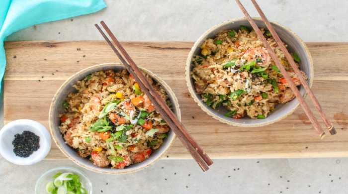 Жареные креветки на сковороде рецепт с рисом из цветной капусты Для Вас рецепт блюдо китайской кухни, которое готовится 10 минут. Очень вкусные жареные креветки с рисом из цветной капусты, приготовленные на сковороде.