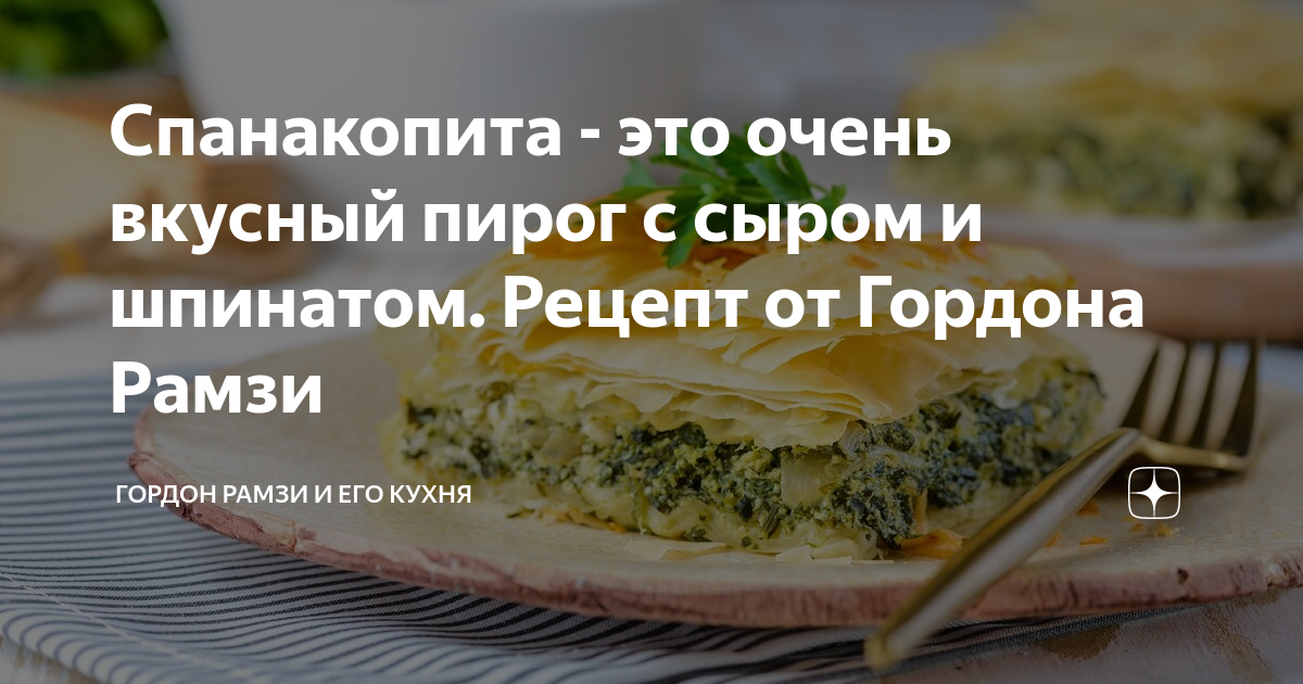 Спанакопита - это очень вкусный пирог с сыром и шпинатом. Рецепт от Гордона Рамзи Спанакопита из книги " Мировая кухня" Гордона Рамзи (Gordon Ramsay „World Kitchen” ) Этот пирог из теста фило со шпинатом,вероятно,самый любимый из всех греческих пирогов (которые весьма часто едят в качестве сытного перекуса). Я предпочитаю подавать его как главное блюдо обеда или на гарнир к запеченной ягнятине.