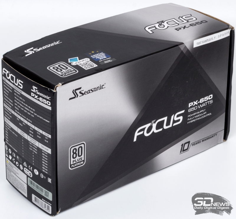 Обзор блока питания Seasonic FOCUS PX-650 (SSR-650PX): молчание — платина Полностью модульные блоки питания серии FOCUS PX включают модели мощностью от 550 до 850 Вт — в отличие от «золотой» серии, киловатт в корпус стандартных размеров с соответствием «платиновой» эффективности уместить не удалось.