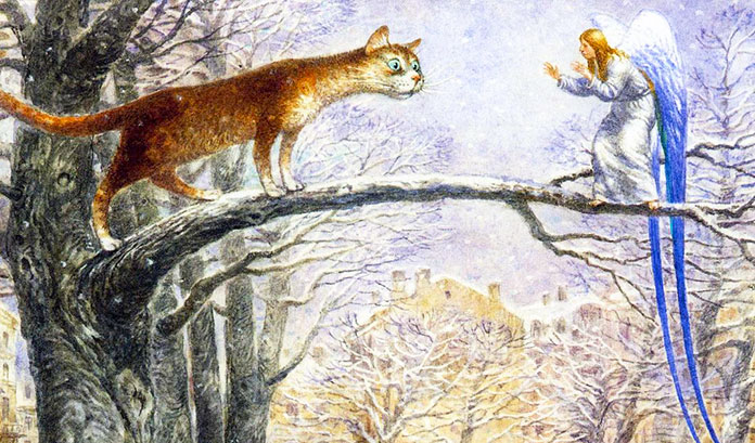 – Мир тебе, – ласково сказал Ангел, присаживаясь рядом с Котом на толстую ветку и стряхивая с неё снег. – Привет, – Кот приоткрыл зелёный глаз, лениво оглядел Ангела и отвернулся. Ангел спрятал под крыльями босые ноги и посмотрел вниз. Под ними лежал белый двор, полный смеха, визга, летающих снежков и скрипа шагов. – Высоко ты забрался, – сказал Ангел, оценивая расстояние до земли. – Зато сюда даже Сашкин снежок не долетит. Ангел понимающе кивнул и подобрал опущенные крылья. Помолчали. – А ты…