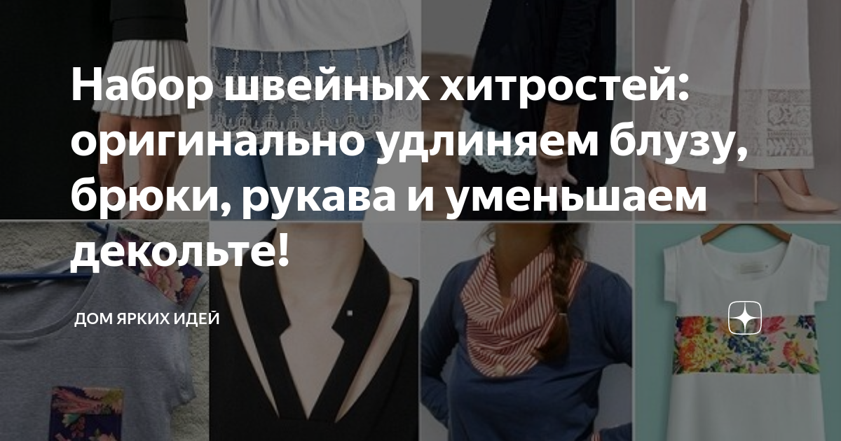 Набор швейных хитростей: оригинально удлиняем блузу, брюки, рукава и уменьшаем декольте! Вашему вниманию небольшая подборка из оригинальных на мой взгляд примеров «швейных хитростей». Предлагаю сложить их в копилочку идей, чтобы достать и воспользоваться в случае необходимости!
