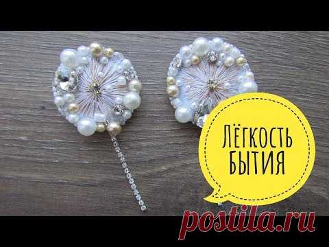 Брошь одуванчик из кристаллов, жемчуга и вышивки мулине