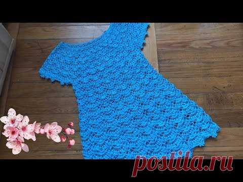 Платье крючком на девочку "Голубая лагуна".Росток,круглая кокетка.Часть 2.
