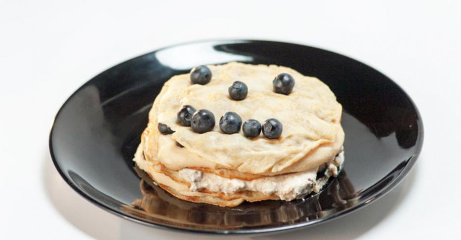 - 1. Застилаем противень пергаментом. Высыпаем орехи кешью на пергамент. Ставим в духовку на 10 минут при температуре 200 градусов. 2. Готовим блинчики. Смешиваем яйцо, столовую ложку сахара, муку, 100 граммов сливок и немного соли. Взбиваем венчиком. Разогреваем сковороду с добавлением сливочного масла. Выпекаем блинчики. Достаем орехи. Остужаем. 3. Готовим творожную прослойку. Протираем через сито творог. Вливаем сливки. Перемешиваем. Добавляем промытый изюм. Слегка нарезаем орехи. Добавляем в смесь. Добавляем 2 столовые ложки сахара. Перемешиваем. 4. Готовим манную прослойку. Вливаем стакан топленого молока в сотейник. Добавляем две чайные ложки сахара, немного ванильного сахара и соли. Ставим на огонь. Доводим до кипения. Всыпаем манку тонкой струйкой, все время помешиваем до загустения. Добавляем сливочное масло. 5. Кладем блинчик на тарелку. На блин выкладываем слой творожной массы. Накрываем блином. Выкладываем кашу. Сверху кладем слой черники. Накрываем блинчиком. Повторяем слои. Сверху украшаем черникой. Приятного аппетита! Рекомендовано для детей старше трех лет.