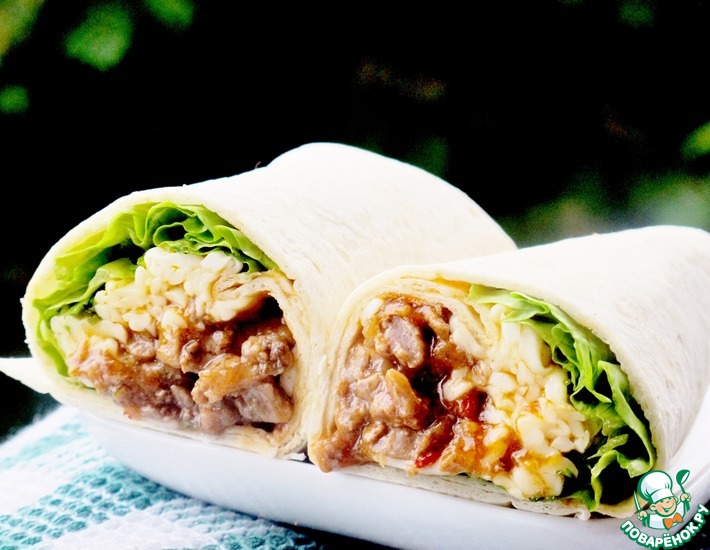 - На сыр сверху положить готовое мясо с томатным соусом чили ТМ "Blue Dragon". Завернуть буррито как конверт. Один конец можно оставить открытым. Также буррито можно подогреть на сковороде или в духовке. В горячем виде тоже вкусно.