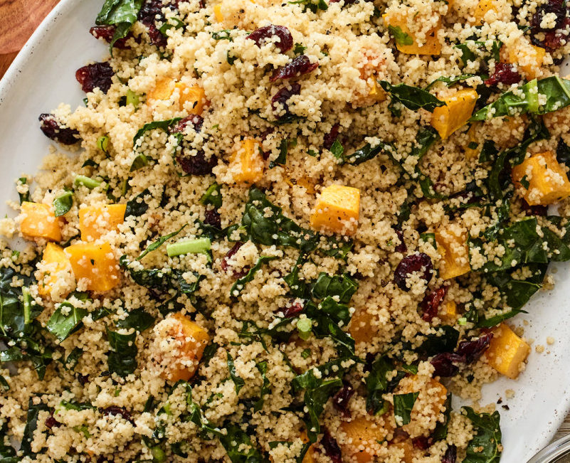 Салат из кускуса со шпинатом и тыквой | О вкусной еде Этот красочный салат вы можете съесть и как самостоятельное блюдо и как гарнир к мясу. Экспериментируйте с ингредиентами: вместо шпината можно использовать мангольд или капусту, сушеные вишни или