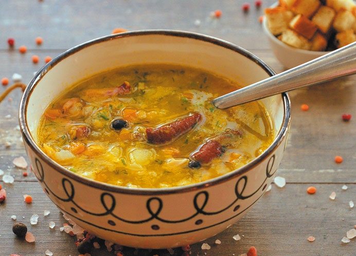 Гороховый суп с копченостями и сухариками Представляем вашему вниманию аппетитный, ароматный, вкуснейший и сытный суп - гороховый с копченостями. Его прекрасно дополнят чесночные сухарики.