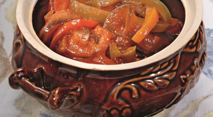 - Из сладкого перца удалить сердцевину, мякоть нарезать соломкой. Баклажаны вымыть, нарезать полукружиями. Положить овощи в кастрюлю с соком и варить на маленьком огне под крышкой 35–40 мин.