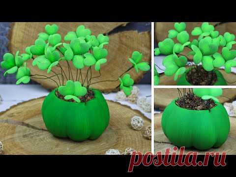 «КЛЕВЕР счастья» из фоамирана в кашпо в виде ТЫКВЫ из гипса своими руками | DIY от Eva-Konfetti