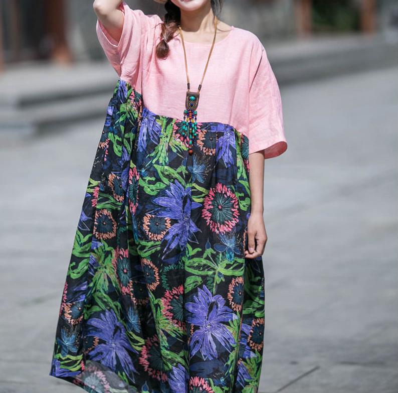 Loose Linen stitching ramie Printed dress Bridal long dress | Etsy