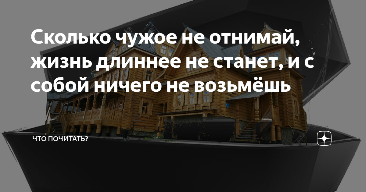 Сколько чужое не отнимай, жизнь длиннее не станет, и с собой ничего не возьмёшь "Жили - были"- так обычно начинается сказка. Больше можно бы ничего и не писать. Трудно определить, на самом деле жив человек или это только ему и нам кажется. Что есть его бытие? Игра в жизнь, небылица - смешная, поучительная, печальная. Как знать? Сегодняшняя бытийная ситуация часто удивительно совпадает со сказочным сюжетом, которому много больше ста лет. Не зря вечно жива сказка,