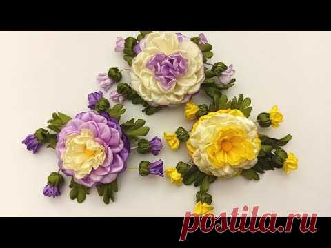 Ribbons Flower and buds.DIY/Flor con brotes de cintas/Цветок с бутонами из лент 2.5см