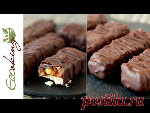 Шоколадные батончики "Сникерс". Для карамели: - 10 шт фиников; - 2 ст. ложки урбеча из обжаренного арахиса; - 1/4 ч. ложки соли (розовой гималайской), если арахисовая паста пресная; - 3-4 ст. ложки воды. Для коржа: - 1/4 стакана замоченной зеленой гречки; - 5 фиников; - 1-2 ст. ложки воды; - 1 ст. ложка кокосового масла; - кокосовая мука Наполнение: обжаренный арахис. Для глазури: горький темперированный домашний шоколад.