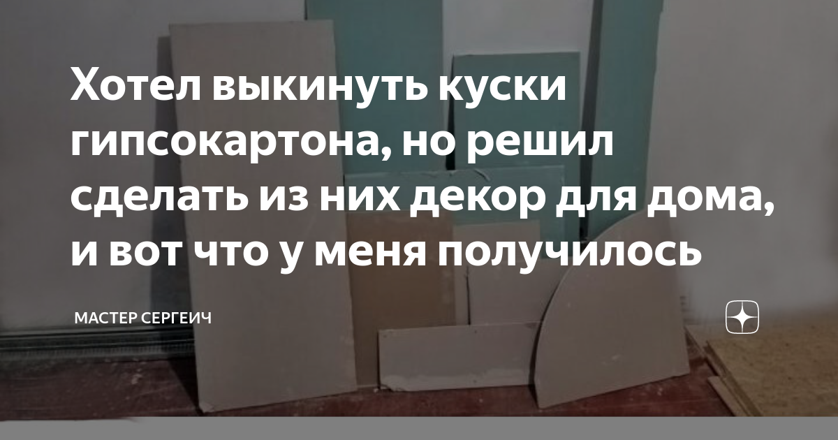Хотел выкинуть куски гипсокартона, но решил сделать из них декор для дома, и вот что у меня получилось У меня после ремонта остались куски гипсокартона, которые валялись в гараже и ждали своего часа. Гипсокартон у меня потолочный, 9 мм толщины, но, это не принципиально, подойдет и стеновой или даже фанер, ДВП и т. д. В общем, решил эти куски превратить в интересный декор для дома, и теперь хочу поделиться с вами, что у меня получилось и как я это