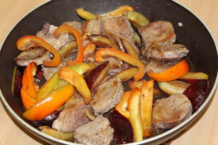 Свиная вырезка со сливами и болгарским перцем | Foodbook.su Очень простое и эффектное блюдо! Для приготовления нужно взять крепкие сливы, иначе они потеряют форму при тушении.