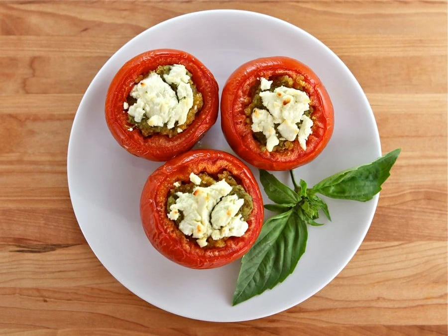 Фаршированные помидоры с песто и козьим сыром Свежие помидоры, фаршированные здоровой смесью киноа, песто, базилика, пармезана и чеснока с теплым запеченным козьим сыром. Молочный, кошерный