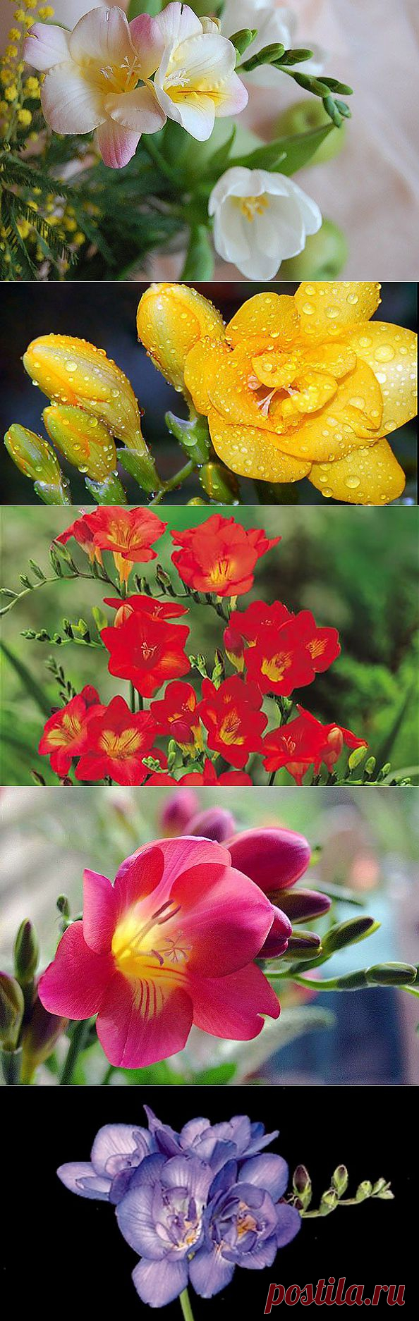 Фрезия - изысканная аристократка. «Фарфоровая» структура лепестков фрезии придаёт её соцветиям трогательную нежность. Наверное, поэтому флористы так любят включать её в цветовую аранжировку. Фрезия символизирует молодость, доверие, безмятежность.