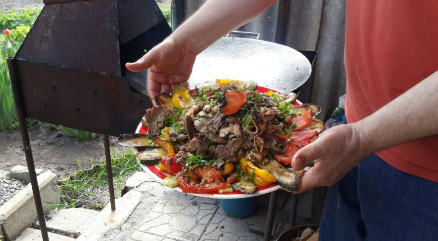 - Далее обжаривать все ингредиенты саджа (блюда) по очереди, исходя из простого принципа – от более плотного по текстуре продукта к менее плотному, но начинать с мяса. Температура поверхности сковороды уменьшается от центра в стороны, поэтому каждый обжаренный в жиру продукт сдвигаем к краям, освобождая место для очередного ингредиента. Либо можно каждый обжаренный продукт убирать на отдельную большую тарелку с тем, чтобы потом все вернуть обратно на садж в конце готовки. Итак, обжариваем мясо, морковь, лук, разрезанную поперек целую головку чеснока, перец, баклажаны, грибы, кабачки. Помидоры добавить в самом конце приготовления. Огонь под саджем должен быть интенсивным, чтобы продукты жарились, а не тушились. Периодически посыпать обжариваемые продукты смесью свежей рубленной зелени, приправляя солью и специями.