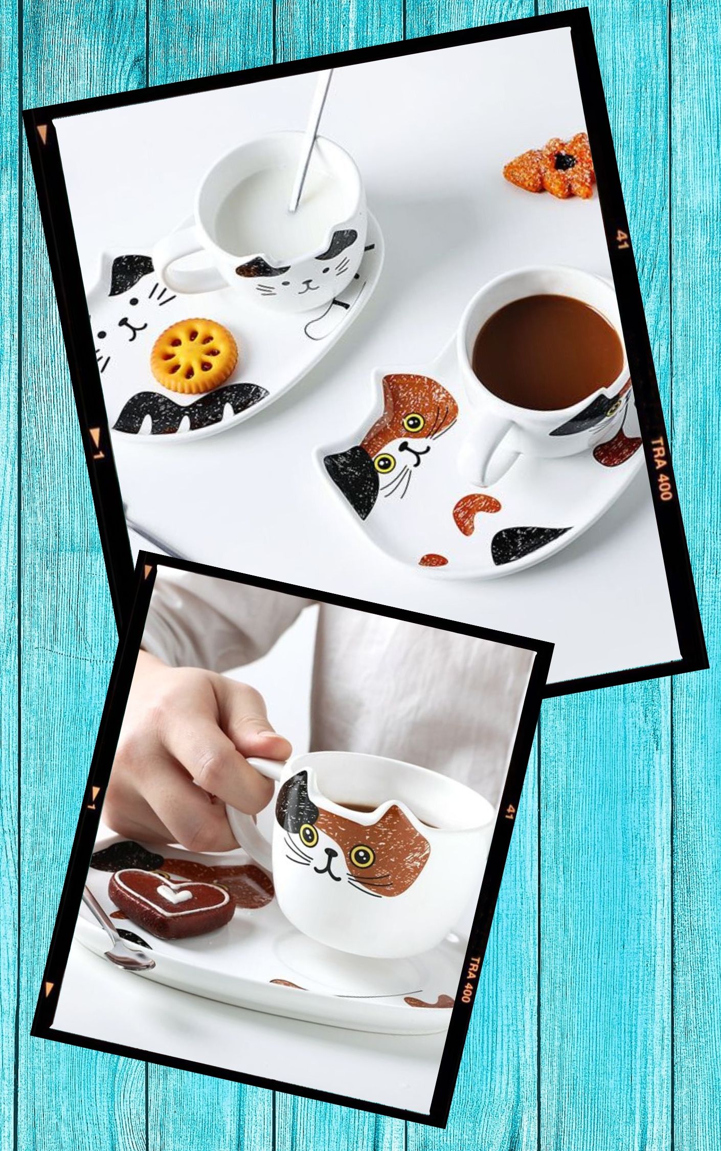Набор из блюдца и кружки в виде котиков. У кружки есть выдающиеся кошачьи уши