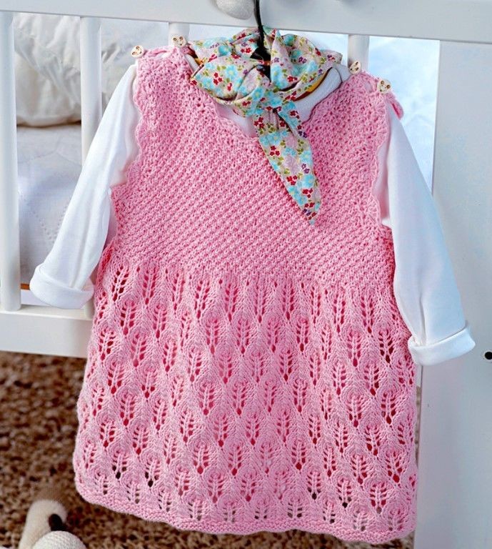 Детское платье с пуговицами на плечах Чудесное платье без рукавов, с пуговками на плечах, очень удобно надевать и снимать. Прекрасное первое платье для малышки! РАЗМЕРЫ 50/56 (62/68) 74/80 ВАМ ПОТРЕБУЕТСЯ Пряжа (100% хлопка; 180 м/50 г) — 100 (100) 150 г розовой; спицы №3; крючок №3; 4 маленькие пуговицы. УЗОРЫ И СХЕМЫ ПЛАТОЧНАЯ ВЯЗКА Узор для планки, спицы №3: лицевые и изнаночные ряды — лицевые петли. ОСНОВНОЙ УЗОР Вязать (спицы №3) по схеме. На ней приведены тольк...