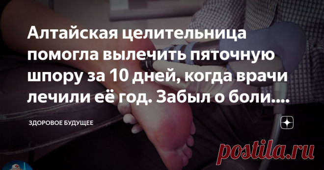 Алтайская целительница помогла вылечить пяточную шпору за 10 дней, когда врачи лечили её год. Забыл о боли. Делюсь средством Заполучил эту болезнь позапрошлым летом. Врачи лечили меня год, но боль не стихала. Алтайская целительница посоветовала рецепт, и через 10 дней боль ушла. Надеюсь, вам будет полезно.