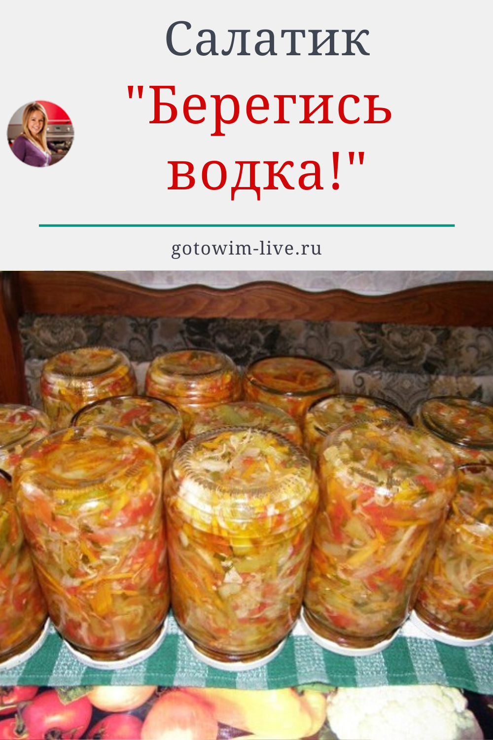 Салат «Берегись, водка!» не похож на большинство закусок, которые готовят на зиму. Он очень очень прост в приготовлении. Через стекло банки отчетливо видны яркие кусочки овощей, сохранившие свой естественный цвет. Это делает салат «Берегись, водка!» очень аппетитным. Овощи в нем хрустящие и имеют вкус свежих.