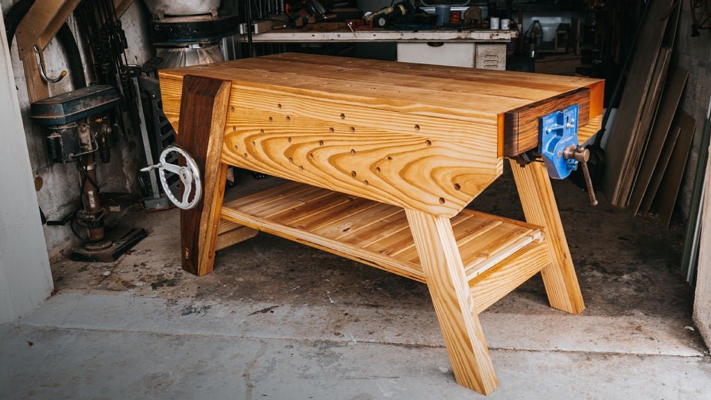 Верстак столяра с различными зажимными приспособлениями В этой статье мастер-самодельщик поделится с нами своим опытом в изготовлении верстака для столярных работ. Верстак имеет вертикальные и горизонтальные тиски, а также специальный зажим, для фиксации деталей на верстаке. Инструменты и материалы:-Пиломатериалы;-Крюк металлический;-Механизм тисков - 2
