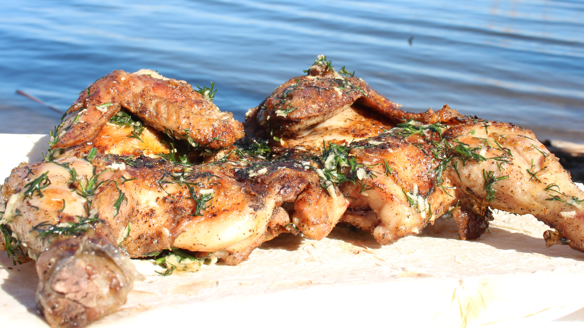 Цыпленок в чесночно-масляном маринаде на углях, рецепт с фото и видео В нашем видео предлагаем Вам рецепт отличного блюда на гриле для приятных летних пикников в кругу родных и друзей. Берите на заметку наш рецепт и отдыхайте вкусно! Цыплёнок на решётке на костре - идеальное мясное блюдо. Цыплёнок жареный целиком на гриле готовится просто и достаточно быстро, а получается с хрустящей корочкой снаружи, а внутри сочный и мягкий, с обильным чесночным вкусом. Сочная курочка с ...